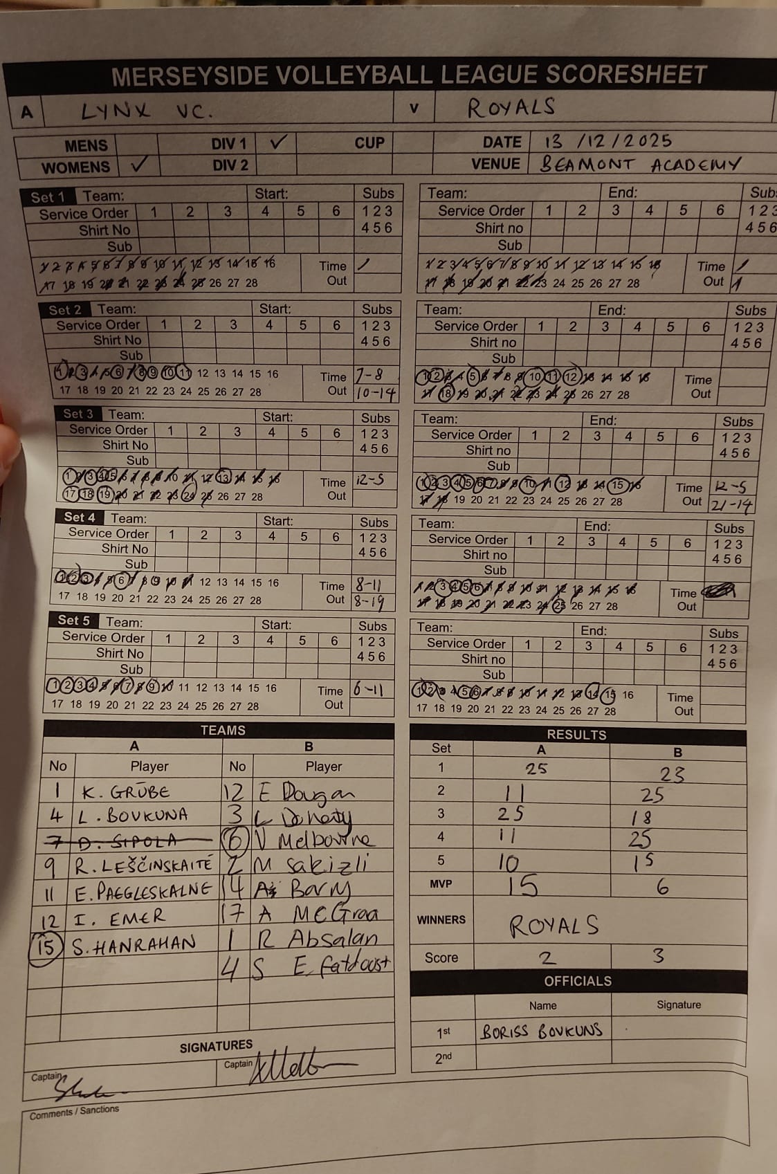 | Royals (W) | 3 | 23 | 25 | 18 | 25 | 15 | Win |