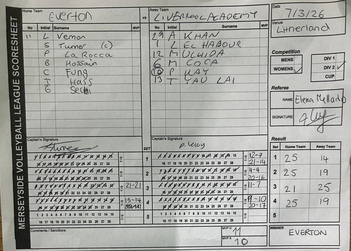 | Everton Seahorses | 3 | 25 | 25 | 21 | 25 | Win |