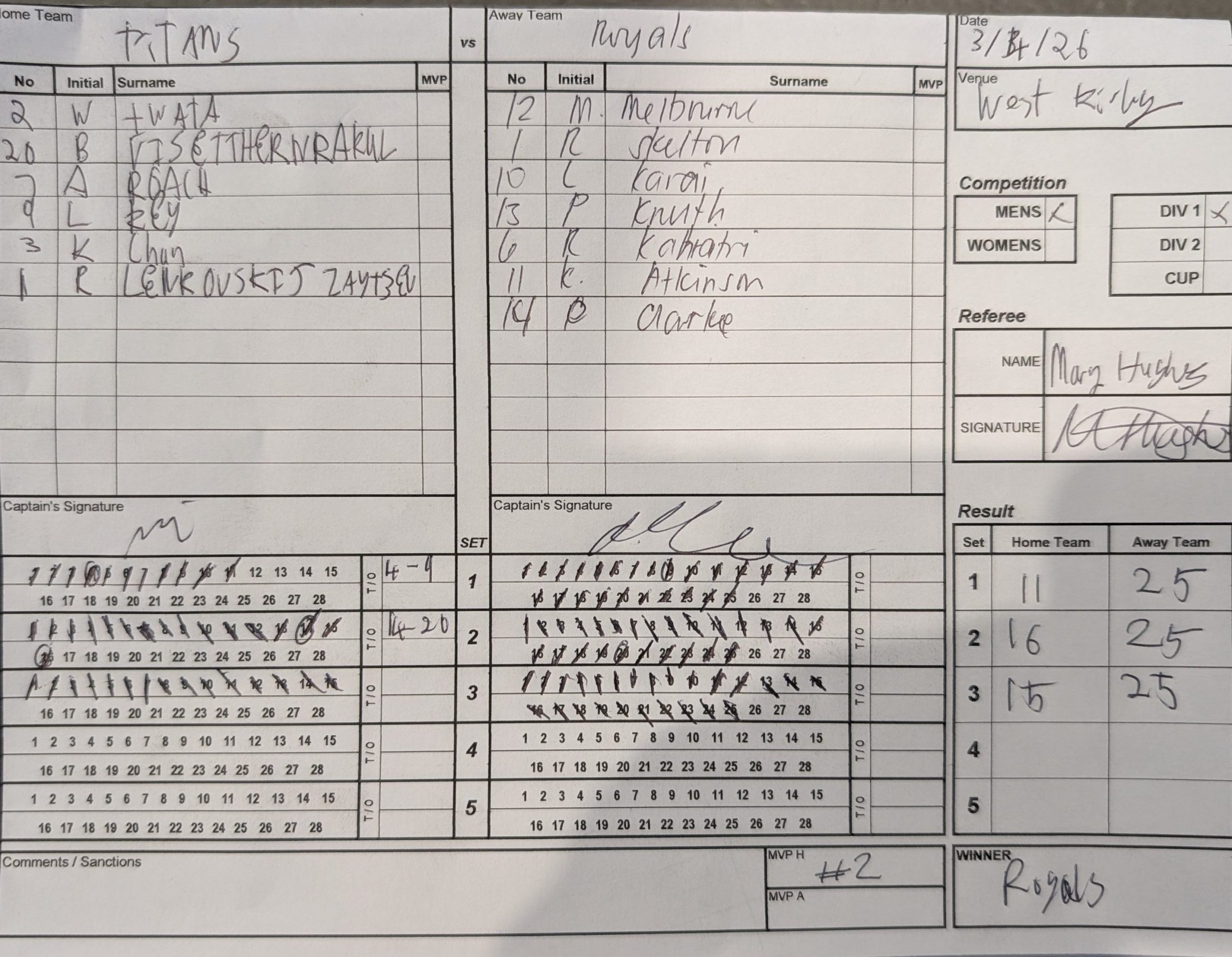 | Royals (M) | 3 | 25 | 25 | 25 | Win |
