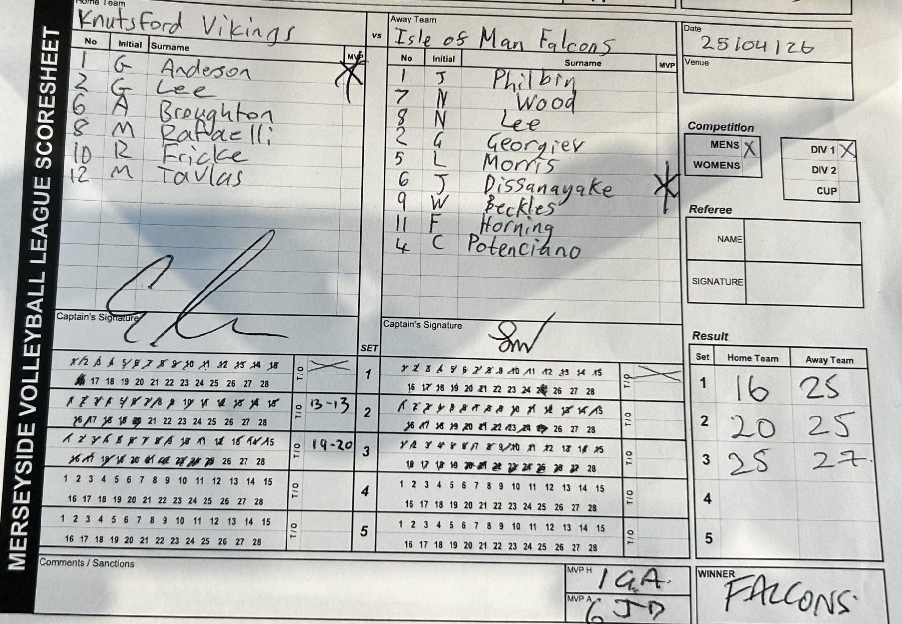 Knutsford Vikings v Isle of Man Falcons v Venue West Kirby School and College West Kirby School and College, Meols Drive, West Kirby, CH48 5DH Details Date Time League Season 25 Apr 2026 14:30 Mens Division 1 2025-26 Preview 1 Graham Lee 2 Aden Broughton 3 Robbi Fricke 4 Mirek Jandus 5 Michele Raffaelli 6 Mark McLean 7 Filippo Barcellos 8 Mehmet Tavlas 9 Matt Everett 10 Alex Rackovs 11 Olly Hill 12 George Anderson 1 Brandon Crellin 2 Caezar Sumauang 3 Carl Potenciano 4 Charles Diocolano 5 Galin Georgiev 6 Jason Philbin 7 Jineth Dissanayake 8 Leo Morris 9 Martin Dysangco 10 Renz Ferrer 11 Falk Horning 12 Mthulisi Ntungakwa (MT) 13 Nathan Wood 14 Neeson Lee 15 Wendell Beckles 16 Jomar Palardon 17 Challis Kariuki 18 Nino Ontoy 19 Dan Smith 20 Jacob Jenner