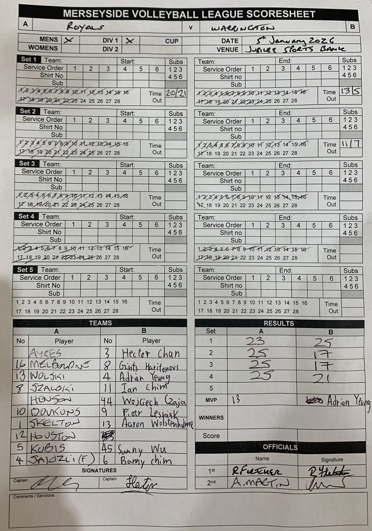 | 05 Jan 2026 | 20:00 | Mens Division 1 | 2025-26 |