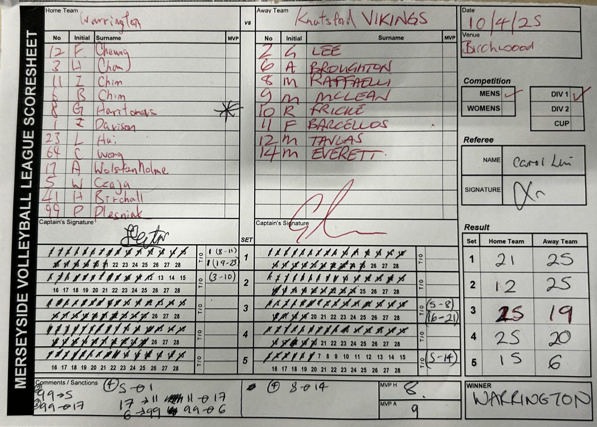 | Knutsford Vikings | 2 | 25 | 25 | 19 | 20 | 6 | Loss |